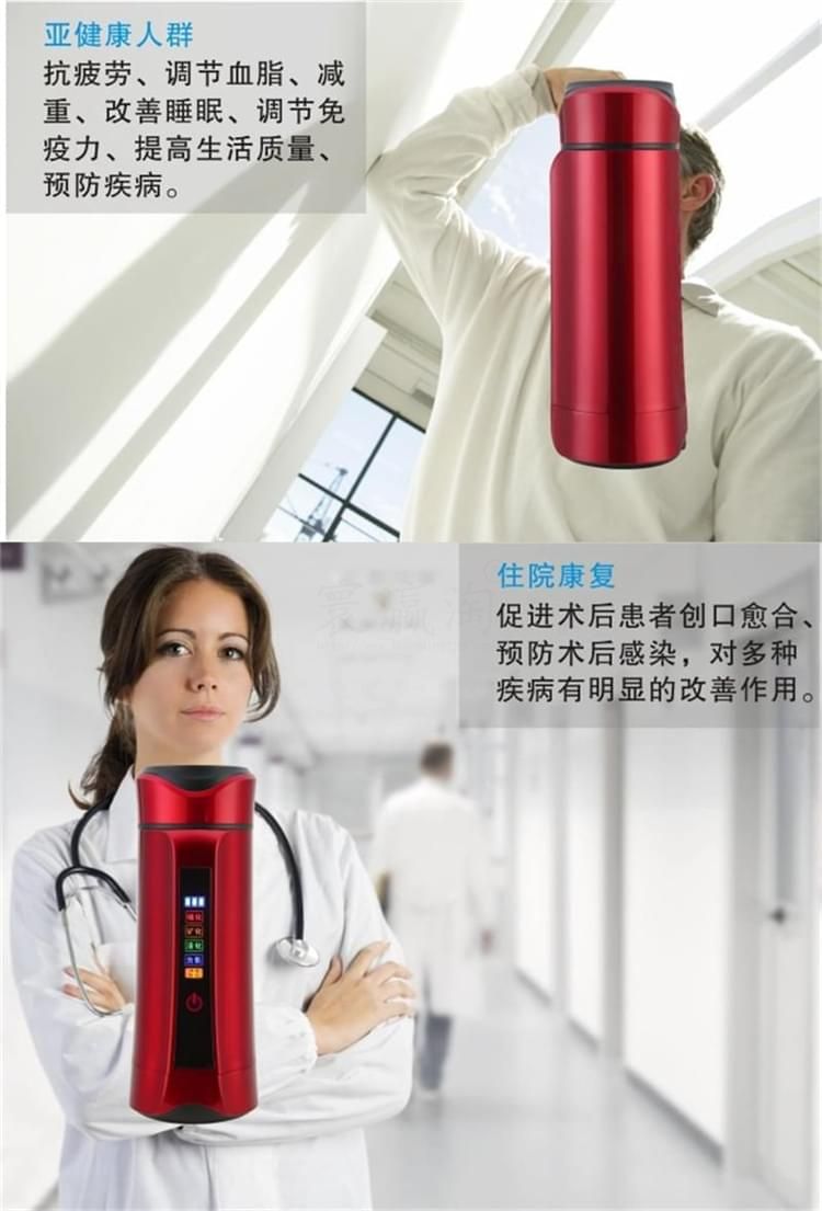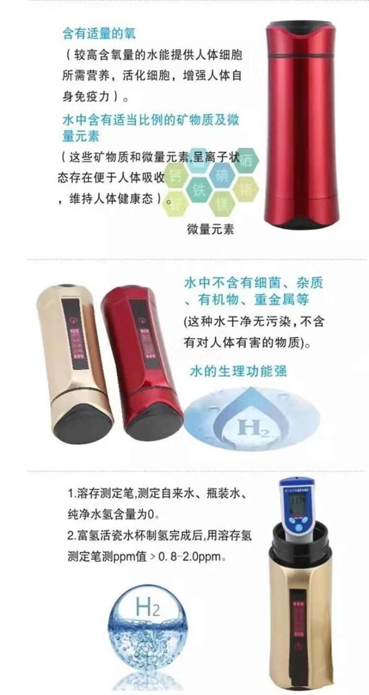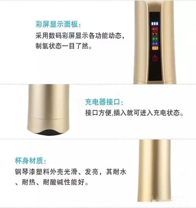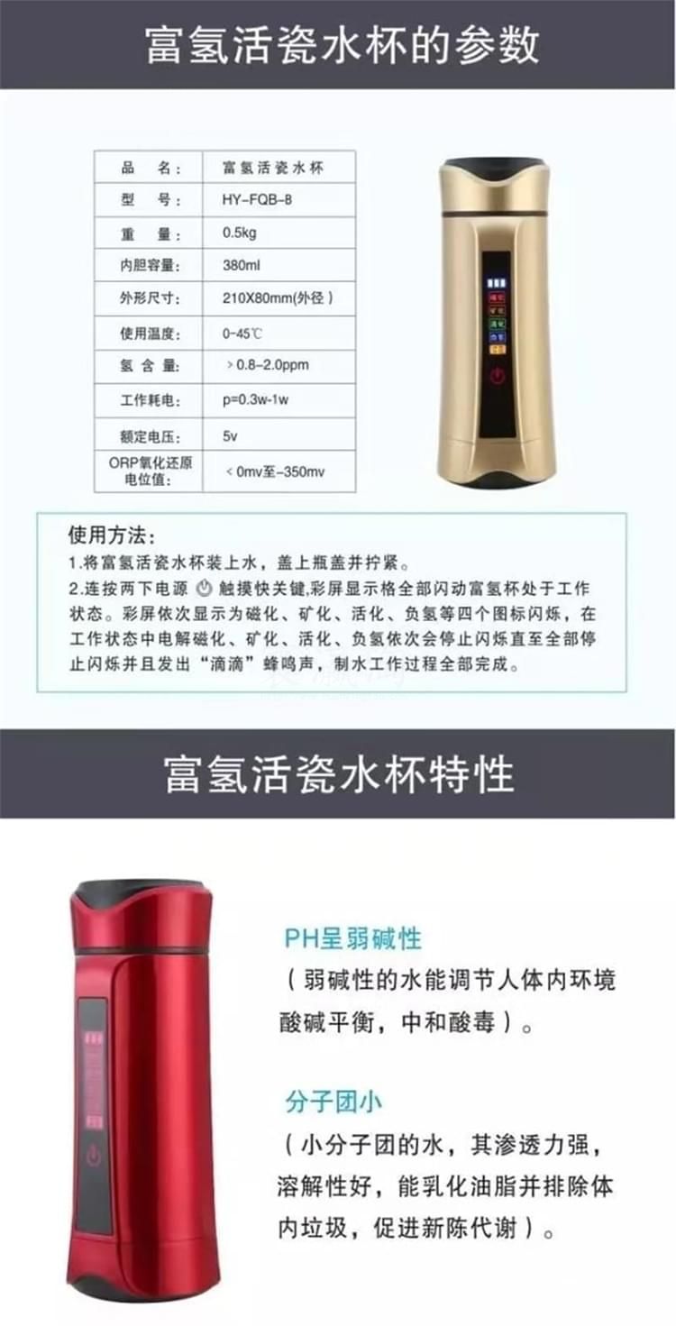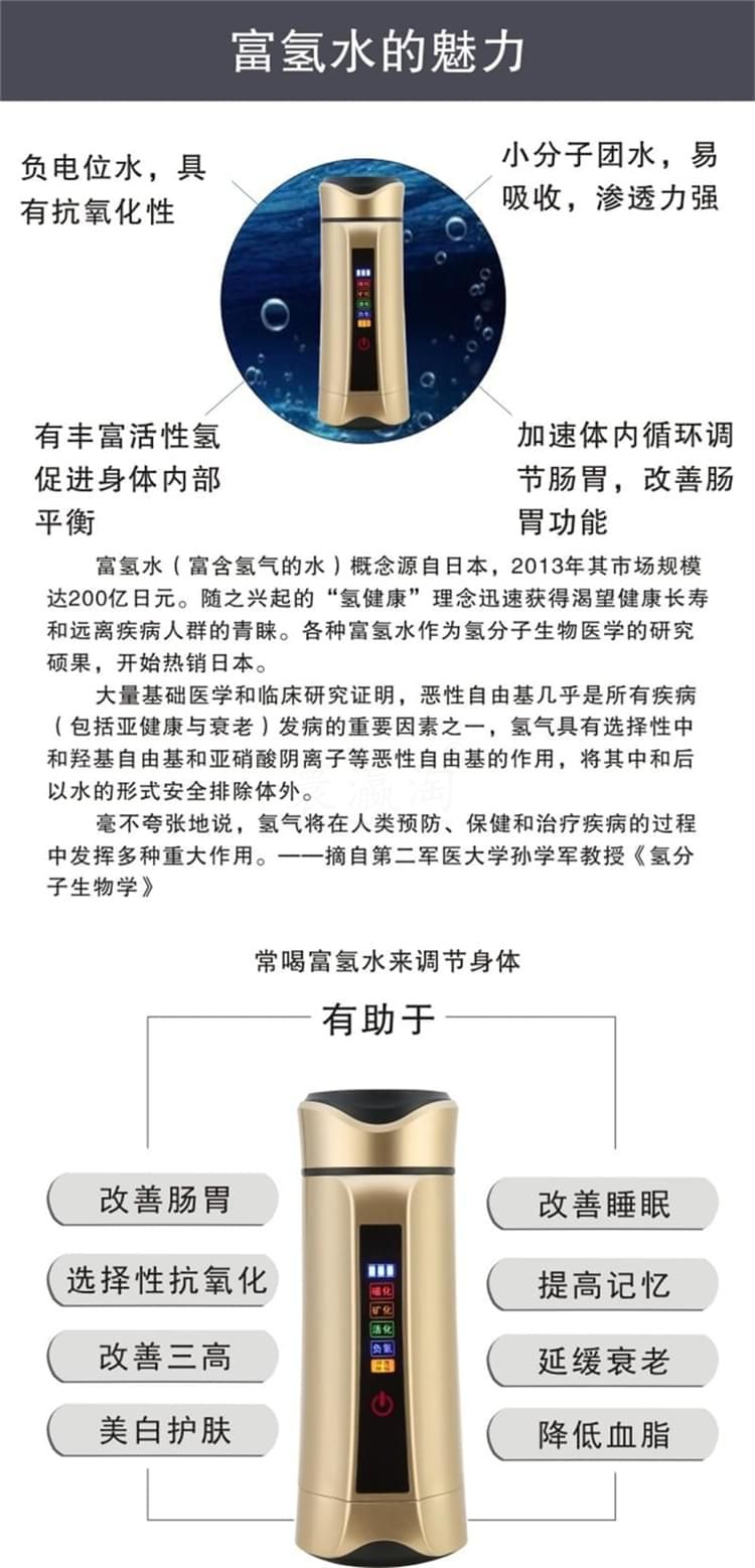 養(yǎng)和水素水杯 水素水杯生杯的使用說(shuō)明 1、檢查外觀配件附件是否齊全完好,遵照說(shuō)明逐步使用。 2、請(qǐng)勿用制水器(杯)制作成、酸,堿水!將本機(jī)所制富氫水倒至茶壺泡茶飲用,另有一番滋味;但請(qǐng)勿在制水器(杯)內(nèi)泡茶或沖泡咖啡等。 3、請(qǐng)勿將制水器(杯)泡在水中清洗或用水沖洗! 4、請(qǐng)勿將制水器(杯)靠近超過(guò)120度高溫物體或火焰! 5、請(qǐng)勿用力碰壓,擠壓本機(jī)控制面板,面板與顯示屏受較大力的碰壓、擠壓容易變形損壞。 6、請(qǐng)將制水器(杯)放在小孩拿不到之處。謹(jǐn)防本機(jī)從高處跌落。 7、首次使用制水器(杯)應(yīng)先用溫水制作2-4次負(fù)氫水將杯內(nèi)膽清洗干凈。養(yǎng)生杯閑置時(shí),應(yīng)倒空杯水。干燥內(nèi)膽及開蓋存放,再次使用時(shí)應(yīng)先洗凈養(yǎng)生杯內(nèi)膽。 8、清潔控制面板:可用稍濕潤(rùn)軟布巾盡量輕柔的擦干凈。 9、清潔內(nèi)膽:對(duì)內(nèi)膽壁結(jié)垢可用少星食用檸檬酸兌水浸泡(或用檸檬片)擦洗干凈;平時(shí)可用布條洗凈內(nèi)膽,也可啟用自動(dòng)清洗功能。 10、制作富氫水建議隨時(shí)制作隨時(shí)飲用。純凈水蒸餾水宜裝半杯,制作2到3次效果更佳。 注意事頂 1、制水器(杯)工作時(shí),不可將金屬的物件放入其內(nèi)膽內(nèi),以免造成電極短路。 2、請(qǐng)不要打開主機(jī)自行修理,否則公司恕不負(fù)責(zé)造成的任何后果。 3、盡量不要使制水器(杯)接觸糊狀物質(zhì),使杯內(nèi)保持分子表面活性。 4、請(qǐng)勿用本品水服藥,泡藥,以免因活性過(guò)強(qiáng)影響藥效。 5、體質(zhì)較弱者在初期使用時(shí)應(yīng)先將水倒?jié)M本杯中兩到三分鐘后再倒換到普通杯中飲用,適應(yīng)后再正常使用。 6、請(qǐng)勿倒入牛奶,碳酸飲料等類似飲品。 7、使用一段時(shí)間后,可能會(huì)有稀出物變渾濁屬于正?,F(xiàn)象。 8、不要用鋒利,尖銳如(鋼處球)的東西擦拭內(nèi)膽。 9、不能使用清潔劑或者是化工揮發(fā)類試劑去擦拭杯子表面。 水素杯技術(shù)參數(shù) 一、產(chǎn)品包裝盒內(nèi)養(yǎng)生杯及其配件 1、便攜式水素杯水杯1臺(tái) 2、充電器1個(gè)(用于給本機(jī)內(nèi)置鋰電池充電) 3、充電用usb連接線1條 4、說(shuō)明書、保修卡 特殊要求 1、出水水質(zhì)安全性:不低于市政自來(lái)水的安全性指標(biāo),符合或優(yōu)于GB 05749-2006生活飲用水衛(wèi)生標(biāo)準(zhǔn)。 2、出水富氫H含量:大于oppm至700ppm或更高;出水氧化還原電位值(ORP)小于0mv至-350mv或更負(fù)。 3、電器安全性:符合G4706.1-2005家用和類似用途電器的安全要求。 4、源水要求:符合或優(yōu)于生活飲用水標(biāo)準(zhǔn)。 5、水溫要求:溫度為5℃-100℃可飲用水。 6、產(chǎn)品使用環(huán)境條件:溫度:-10-45℃:相對(duì)濕度:45%PH~90PH:大氣壓:86kpa。 7、工作耗電:P=0.?3w-1w.充電器或外接電源從本機(jī)USB插座輸入的充電電壓:DV4.5V-5.5V。 8、杯內(nèi)鋰電池使用壽命:標(biāo)準(zhǔn)與手機(jī)鋰電池相同。 9、主要機(jī)械指標(biāo):內(nèi)膽容量:380毫升;外形尺寸210mm(高)x80mm(外徑):本杯凈重0.5KG。 10、免費(fèi)保修質(zhì)量保證期從購(gòu)買起一年,因使用不當(dāng)損壞不屬于免費(fèi)保修:三年質(zhì)保優(yōu)惠條款詳見(jiàn)保修卡。 零售價(jià):¥3900.00元。 支持批發(fā)。...