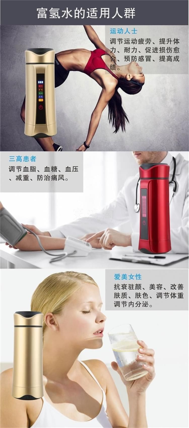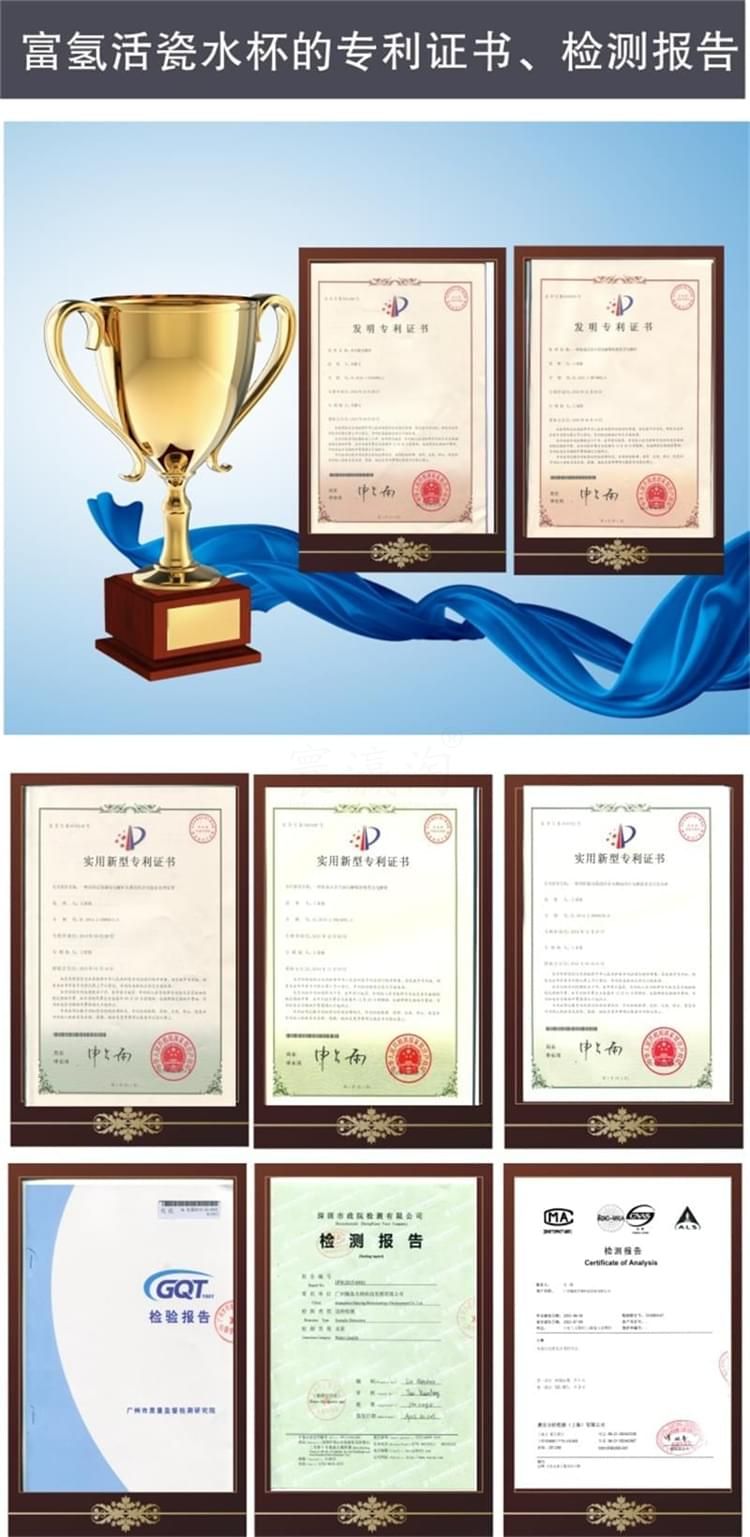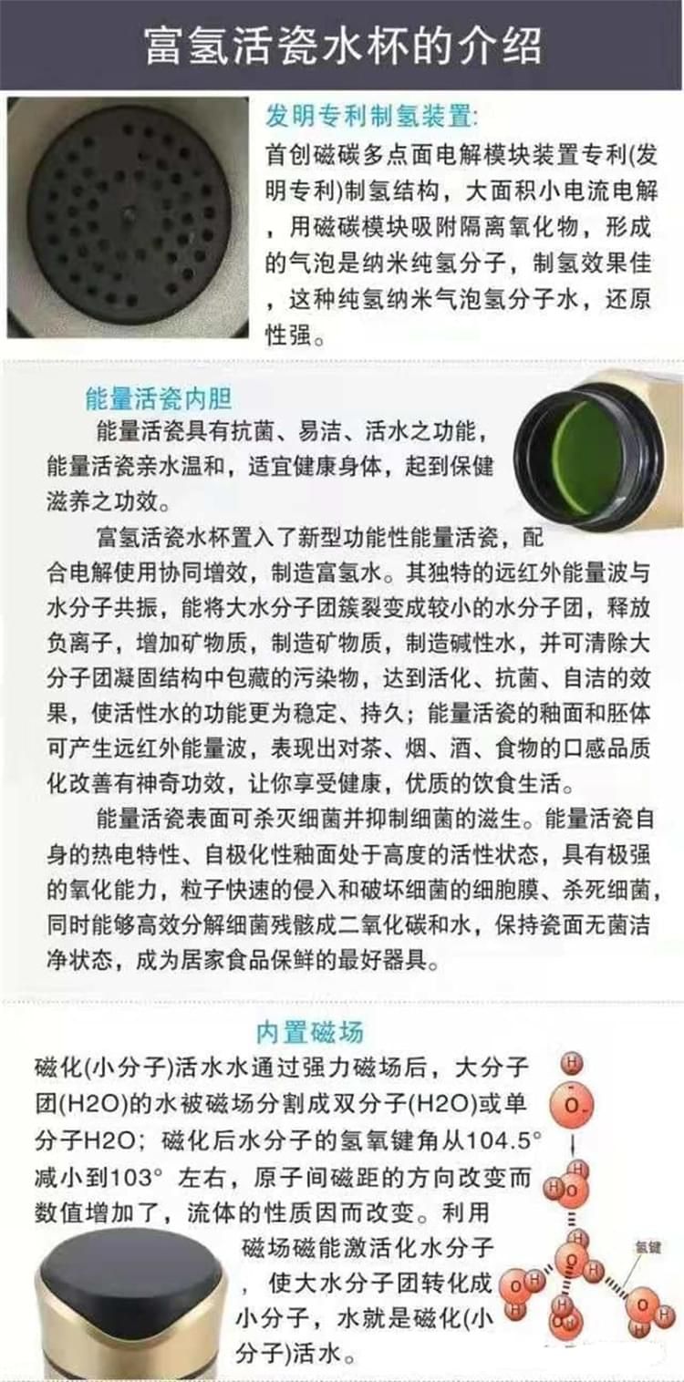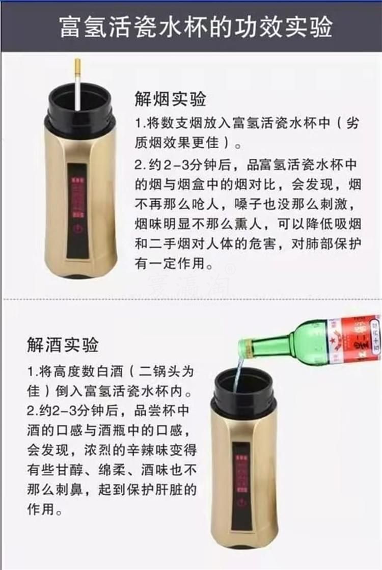 養(yǎng)和水素水杯 水素水杯生杯的使用說(shuō)明 1、檢查外觀配件附件是否齊全完好,遵照說(shuō)明逐步使用。 2、請(qǐng)勿用制水器(杯)制作成、酸,堿水!將本機(jī)所制富氫水倒至茶壺泡茶飲用,另有一番滋味;但請(qǐng)勿在制水器(杯)內(nèi)泡茶或沖泡咖啡等。 3、請(qǐng)勿將制水器(杯)泡在水中清洗或用水沖洗! 4、請(qǐng)勿將制水器(杯)靠近超過(guò)120度高溫物體或火焰! 5、請(qǐng)勿用力碰壓,擠壓本機(jī)控制面板,面板與顯示屏受較大力的碰壓、擠壓容易變形損壞。 6、請(qǐng)將制水器(杯)放在小孩拿不到之處。謹(jǐn)防本機(jī)從高處跌落。 7、首次使用制水器(杯)應(yīng)先用溫水制作2-4次負(fù)氫水將杯內(nèi)膽清洗干凈。養(yǎng)生杯閑置時(shí),應(yīng)倒空杯水。干燥內(nèi)膽及開蓋存放,再次使用時(shí)應(yīng)先洗凈養(yǎng)生杯內(nèi)膽。 8、清潔控制面板:可用稍濕潤(rùn)軟布巾盡量輕柔的擦干凈。 9、清潔內(nèi)膽:對(duì)內(nèi)膽壁結(jié)垢可用少星食用檸檬酸兌水浸泡(或用檸檬片)擦洗干凈;平時(shí)可用布條洗凈內(nèi)膽,也可啟用自動(dòng)清洗功能。 10、制作富氫水建議隨時(shí)制作隨時(shí)飲用。純凈水蒸餾水宜裝半杯,制作2到3次效果更佳。 注意事頂 1、制水器(杯)工作時(shí),不可將金屬的物件放入其內(nèi)膽內(nèi),以免造成電極短路。 2、請(qǐng)不要打開主機(jī)自行修理,否則公司恕不負(fù)責(zé)造成的任何后果。 3、盡量不要使制水器(杯)接觸糊狀物質(zhì),使杯內(nèi)保持分子表面活性。 4、請(qǐng)勿用本品水服藥,泡藥,以免因活性過(guò)強(qiáng)影響藥效。 5、體質(zhì)較弱者在初期使用時(shí)應(yīng)先將水倒?jié)M本杯中兩到三分鐘后再倒換到普通杯中飲用,適應(yīng)后再正常使用。 6、請(qǐng)勿倒入牛奶,碳酸飲料等類似飲品。 7、使用一段時(shí)間后,可能會(huì)有稀出物變渾濁屬于正?,F(xiàn)象。 8、不要用鋒利,尖銳如(鋼處球)的東西擦拭內(nèi)膽。 9、不能使用清潔劑或者是化工揮發(fā)類試劑去擦拭杯子表面。 水素杯技術(shù)參數(shù) 一、產(chǎn)品包裝盒內(nèi)養(yǎng)生杯及其配件 1、便攜式水素杯水杯1臺(tái) 2、充電器1個(gè)(用于給本機(jī)內(nèi)置鋰電池充電) 3、充電用usb連接線1條 4、說(shuō)明書、保修卡 特殊要求 1、出水水質(zhì)安全性:不低于市政自來(lái)水的安全性指標(biāo),符合或優(yōu)于GB 05749-2006生活飲用水衛(wèi)生標(biāo)準(zhǔn)。 2、出水富氫H含量:大于oppm至700ppm或更高;出水氧化還原電位值(ORP)小于0mv至-350mv或更負(fù)。 3、電器安全性:符合G4706.1-2005家用和類似用途電器的安全要求。 4、源水要求:符合或優(yōu)于生活飲用水標(biāo)準(zhǔn)。 5、水溫要求:溫度為5℃-100℃可飲用水。 6、產(chǎn)品使用環(huán)境條件:溫度:-10-45℃:相對(duì)濕度:45%PH~90PH:大氣壓:86kpa。 7、工作耗電:P=0.?3w-1w.充電器或外接電源從本機(jī)USB插座輸入的充電電壓:DV4.5V-5.5V。 8、杯內(nèi)鋰電池使用壽命:標(biāo)準(zhǔn)與手機(jī)鋰電池相同。 9、主要機(jī)械指標(biāo):內(nèi)膽容量:380毫升;外形尺寸210mm(高)x80mm(外徑):本杯凈重0.5KG。 10、免費(fèi)保修質(zhì)量保證期從購(gòu)買起一年,因使用不當(dāng)損壞不屬于免費(fèi)保修:三年質(zhì)保優(yōu)惠條款詳見(jiàn)保修卡。 零售價(jià):¥3900.00元。 支持批發(fā)。...