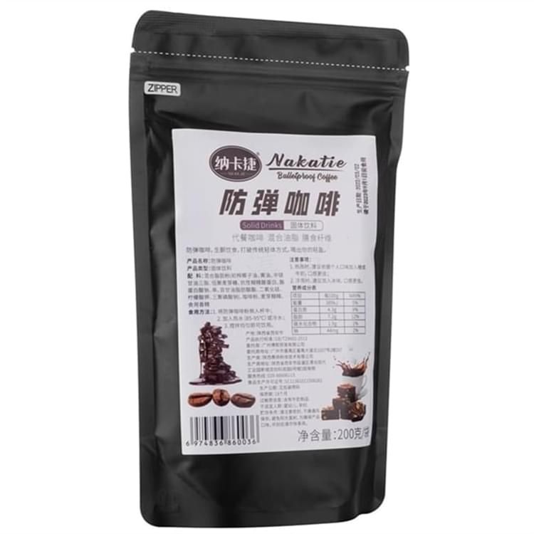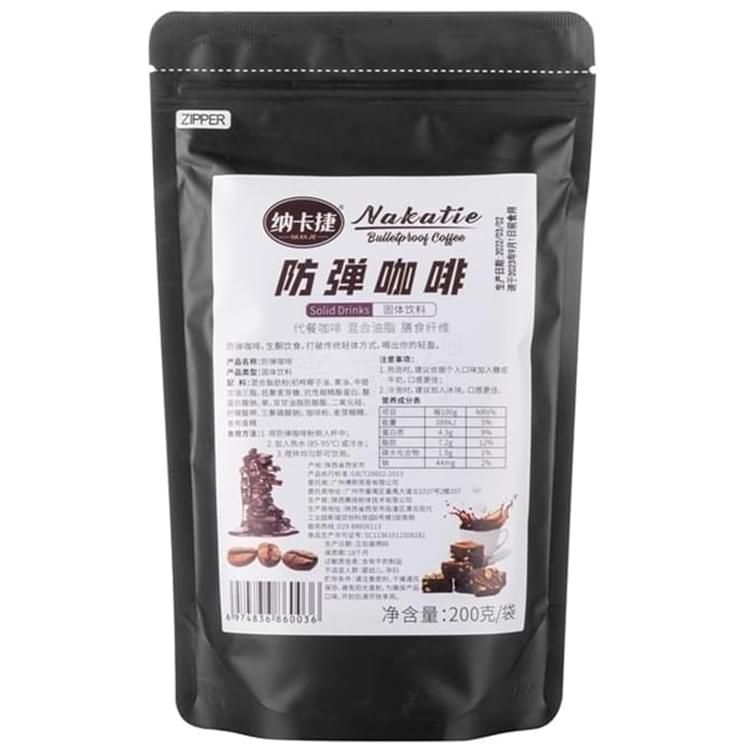 納卡捷防彈咖啡 Solid Drinks 固體飲料? 代餐咖啡混合油脂膳食纖維 防彈咖啡,生酮飲食,打破傳統(tǒng)輕體方式,喝出你的輕盈。 產(chǎn)品名稱:防彈咖啡? 產(chǎn)品類型:固體飲料? 配料:混合脂肪粉初榨椰子油、黃油、中鏈甘油三酯、 低聚麥芽糖、抗性糊精酪蛋白、酪蛋白酸鈉、單,雙甘油脂肪酸酯、二氧化硅、 檸檬酸鉀、三聚磷酸鈉)、咖啡粉、麥芽糊精、? 食用香精? 食用方法: 1、將防彈咖啡粉倒入杯中;? 2、加入熱水(85-95℃)或冷水;? 3、攪拌均勻即可飲用。 注意事項(xiàng):? 1、熱泡時(shí),建議依據(jù)個(gè)人口味加入糖或牛奶,口感更佳; ?2、冷泡時(shí),建議加入冰塊,口感更佳。? 生產(chǎn)日期:見(jiàn)包裝噴碼 保質(zhì)期:18個(gè)月 過(guò)敏原信息:含有牛奶制品 不適宜人群:嬰幼兒、孕婦 貯存條件:請(qǐng)注意密封,干燥通風(fēng)保存,避免陽(yáng)光直射,為確保產(chǎn)品口味,開(kāi)到后請(qǐng)盡快享用。 凈含量:200克/袋。 零售價(jià):¥160.00元。 支持批發(fā)。...