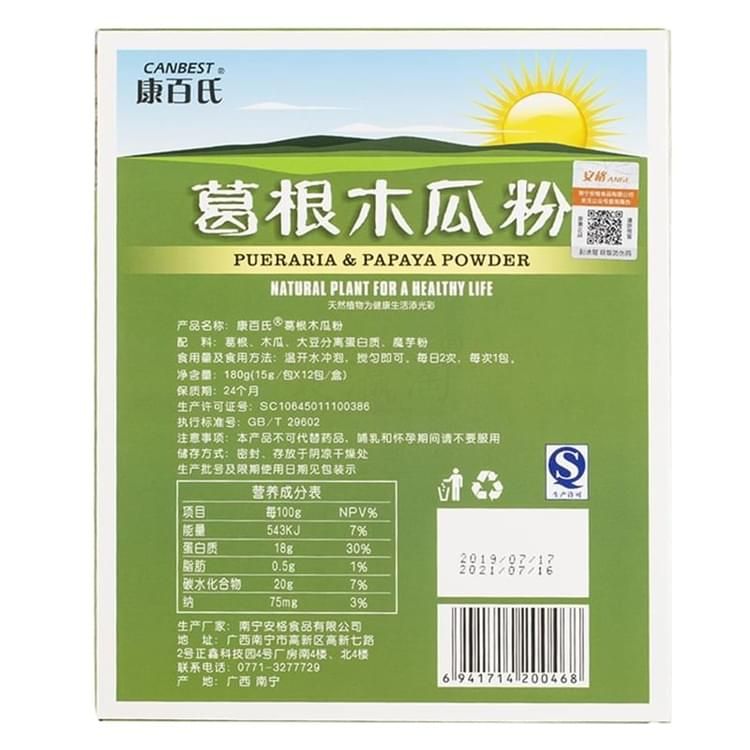 康百氏葛根木瓜粉 配料:葛根、木瓜、大豆分離蛋白質(zhì)、魔芋粉 食用量及食用方法:溫開水沖泡、攪勻即可。每日2次,每次1包。 營養(yǎng)成分表 項(xiàng)目 每100克(g) 營養(yǎng)素參考值% 能量 543KJ 7% 蛋白質(zhì) 18克(g) 30% 脂肪 0.5克(g) 1% 碳水化合物 20克(g) 7% 鈉 75毫克(mg) 3% 凈含量:180克(15克/*12包/盒) 保質(zhì)期:24個(gè)月 生產(chǎn)許可證號:SC10645011100386 執(zhí)行標(biāo)準(zhǔn)號:GB/T29602 保存方式:置于陰涼干燥通風(fēng)處保存 產(chǎn)地:廣西?南寧 注意事項(xiàng):本產(chǎn)品不可替代藥品,哺乳和懷孕期間請不要服用。 零售價(jià):¥138.00元。 支持批發(fā)。...