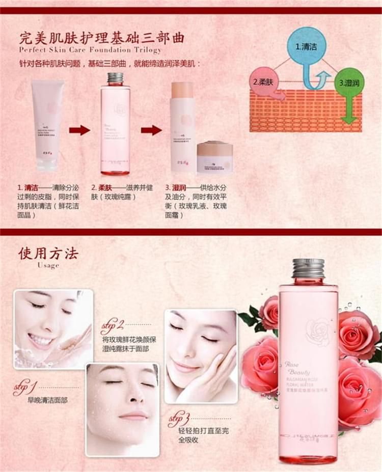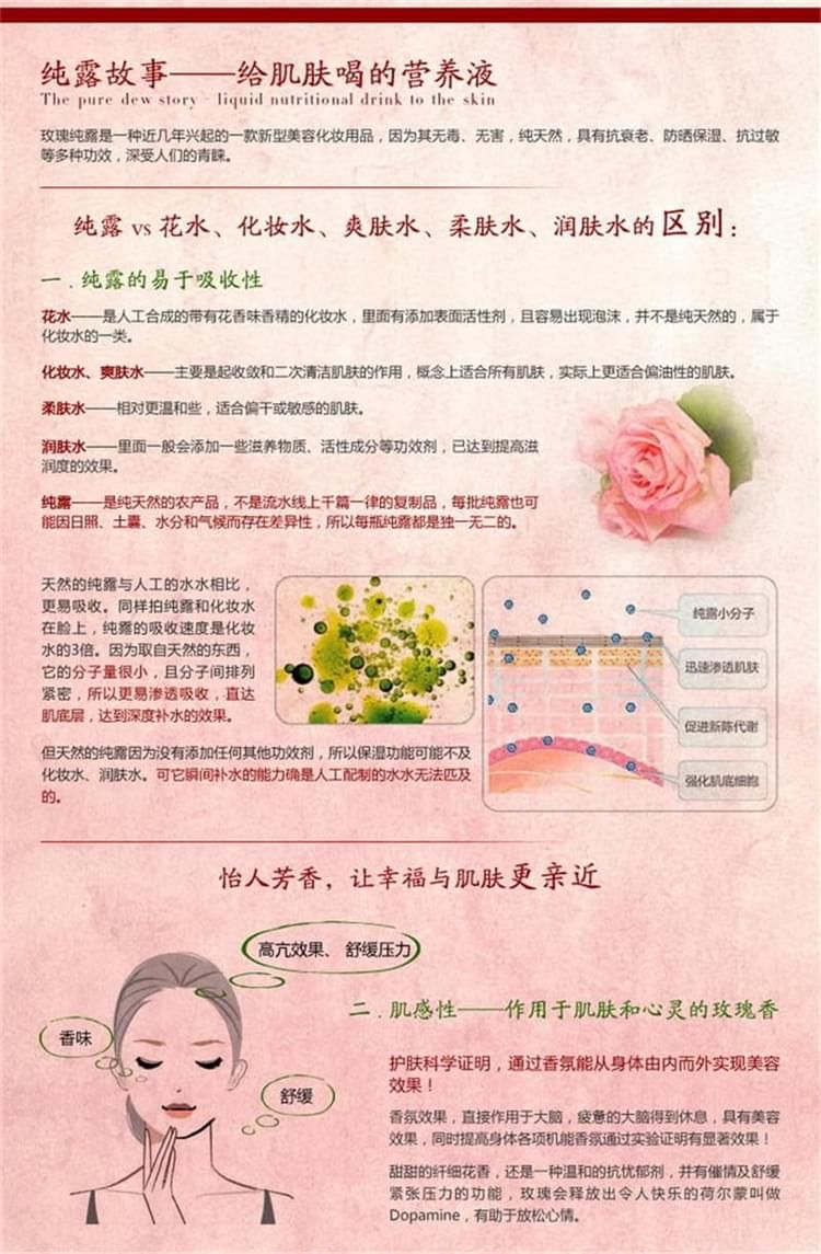 花容道系列 花容道玫瑰鮮花煥顏保濕純露 保加利亞野生玫瑰花瓣精粹。 純露vs花水、化妝水、爽膚水、柔膚水、潤膚水的區(qū)別 花水——是人工合成的帶有花香味的化妝水,里面有添加表面活性劑,且容易出現(xiàn)泡沫,并不是純天然的,屬于化妝水的一類。 化妝水、爽膚水——主要是起收斂和二次清潔肌膚的作用,概念上適合所有肌膚,實際上更適合偏油性的肌膚。 柔膚水——相對更溫和些,適合偏干和敏感的肌膚。 潤膚水——里面一般會添加一些滋養(yǎng)物質(zhì)、活性成分等功效劑,已達(dá)到提高滋潤度的效果。 純露——是純天然的農(nóng)產(chǎn)品,不是流水線上千篇一律的復(fù)制品,每批純露也可能因日照、土壤、水分和氣候而存在差異性,所以每瓶純露都是獨(dú)一無二的。 凈含量:180ml 零售價:¥138.00元。 支持批發(fā)。...