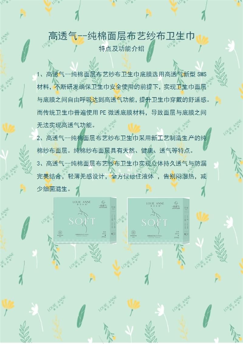 2、高透氣--純棉面層布藝紗布衛(wèi)生巾采用新工藝制造生產(chǎn)的純棉紗布面層。純棉紗布面層具有天然、健康、透氣等特點(diǎn)。