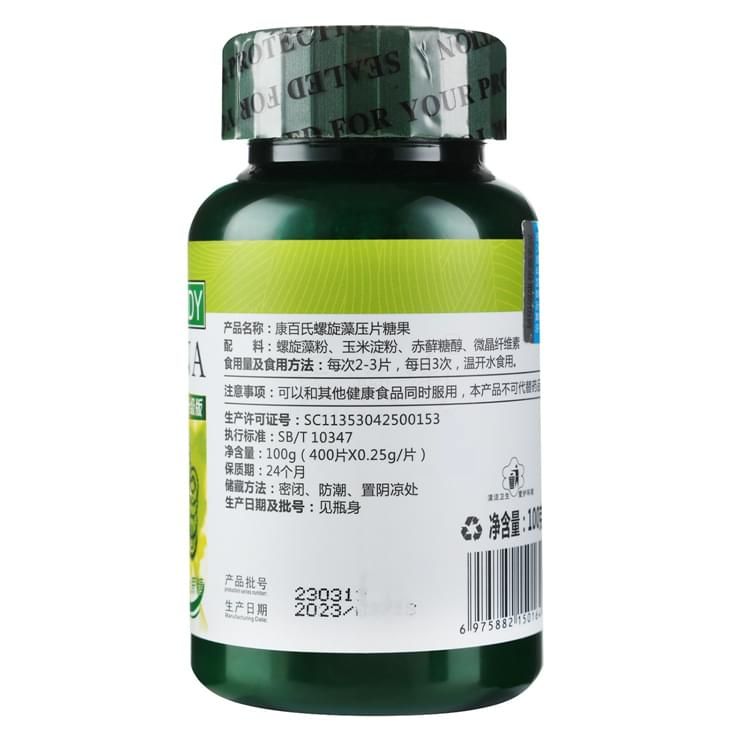 康百氏螺旋藻(壓片糖果) 超細(xì)微、強(qiáng)吸收 生物破壁技術(shù) 螺旋藻含有豐富的蛋白質(zhì)、維生素以及胡蘿卜素、藻多糖和亞麻酸等物質(zhì),是理想的天然綠色健康食品。 配料:螺旋藻粉、食用淀粉 食用量及食用方法:每日三次,餐前或餐后食用,每次4—6片,兒童減半。 保質(zhì)期:24個(gè)月 凈含量:100g (400片※0.25g/片) 注意事項(xiàng): 本產(chǎn)品不能替代藥品。 本產(chǎn)品應(yīng)遠(yuǎn)離兒童。 服用本產(chǎn)品前請(qǐng)咨詢(xún)您的醫(yī)生,特別是如果您正在懷孕、哺乳、已有醫(yī)療狀況或正在服用處方藥。不要超過(guò)每日推薦攝入量。 其他以產(chǎn)品實(shí)物說(shuō)明為準(zhǔn)。 零售價(jià):¥58.00元。 支持批發(fā)。...