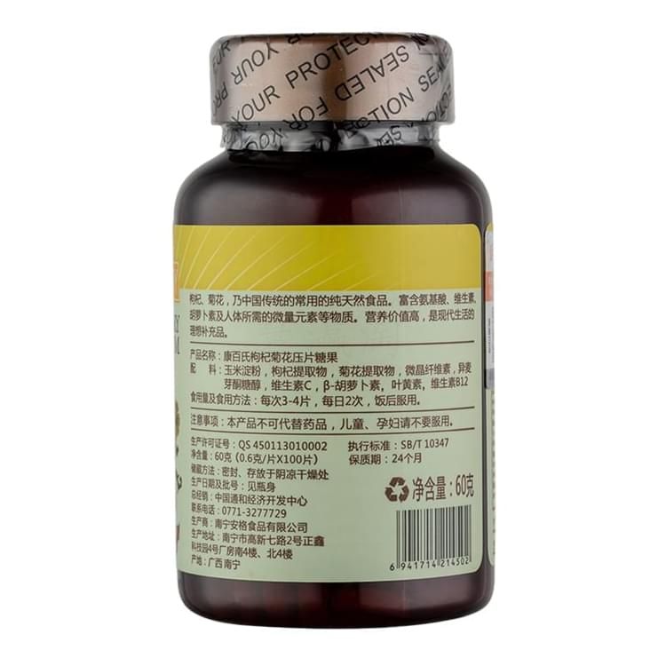 康百氏枸杞菊花(壓片糖果) 枸杞、菊花,乃中國傳統(tǒng)的常用的純天然食品。富含氨基酸、維生素、胡蘿卜素及人體所需的微量元素等物質(zhì)。營養(yǎng)價值高,是現(xiàn)代生活的理想補(bǔ)充品。 配料:枸杞、菊花、復(fù)合氨基酸、食用玉米淀粉、異麥芽酮糖醇、麥芽糊精。 食用量及食用方法:每次3—4片,每日2次,飯后服用。 保質(zhì)期:24個月。 凈含量:60g (100片※0.6g/片)。 注意事項: 本產(chǎn)品不能替代藥品。 本產(chǎn)品應(yīng)遠(yuǎn)離兒童。 服用本產(chǎn)品前請咨詢您的醫(yī)生,特別是如果您正在懷孕、哺乳、已有醫(yī)療狀況或正在服用處方藥。不要超過每日推薦攝入量。 其他以產(chǎn)品實物說明為準(zhǔn)。 零售價:¥68.00元。 支持批發(fā)。...