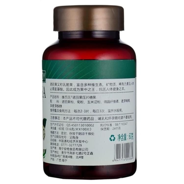 康百氏諾麗果(壓片糖果) 諾麗果又稱乳酪果,富含多種維生素、礦物質(zhì)、稀有元素及人體必需氨基酸。因此成為果中之王,鞏固人體健康之本。 配料:諾麗果粉、菊粉、玉米淀粉、微晶纖維素、異麥芽糖醇、麥芽糊精。 食用量及食用方法:每次2—3片,每日3次,溫開水服用。 保質(zhì)期:24個月。 凈含量:60g (100片※0.6g/片)。 注意事項: 本產(chǎn)品不能替代藥品。 本產(chǎn)品應(yīng)遠離兒童。 服用本產(chǎn)品前請咨詢您的醫(yī)生,特別是如果您正在懷孕、哺乳、已有醫(yī)療狀況或正在服用處方藥。不要超過每日推薦攝入量。 其他以產(chǎn)品實物說明為準。 零售價:¥68.00元。 支持批發(fā)。...